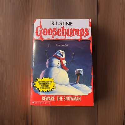 The product is a first print paperback book titled "Beware, The Snowman" from the Goosebumps series by R.L. Stine. Published in 1997 by Scholastic, the book is written in English and falls under the genres of adventure, horror, and is targeted towards children and young adults. The book is set in a school setting and was likely aimed at young readers who enjoy spooky and thrilling tales. It includes stickers and is from the 1990s era, making it a collectible item for fans of the Goosebumps series and horror genre in general. some creasing see photos