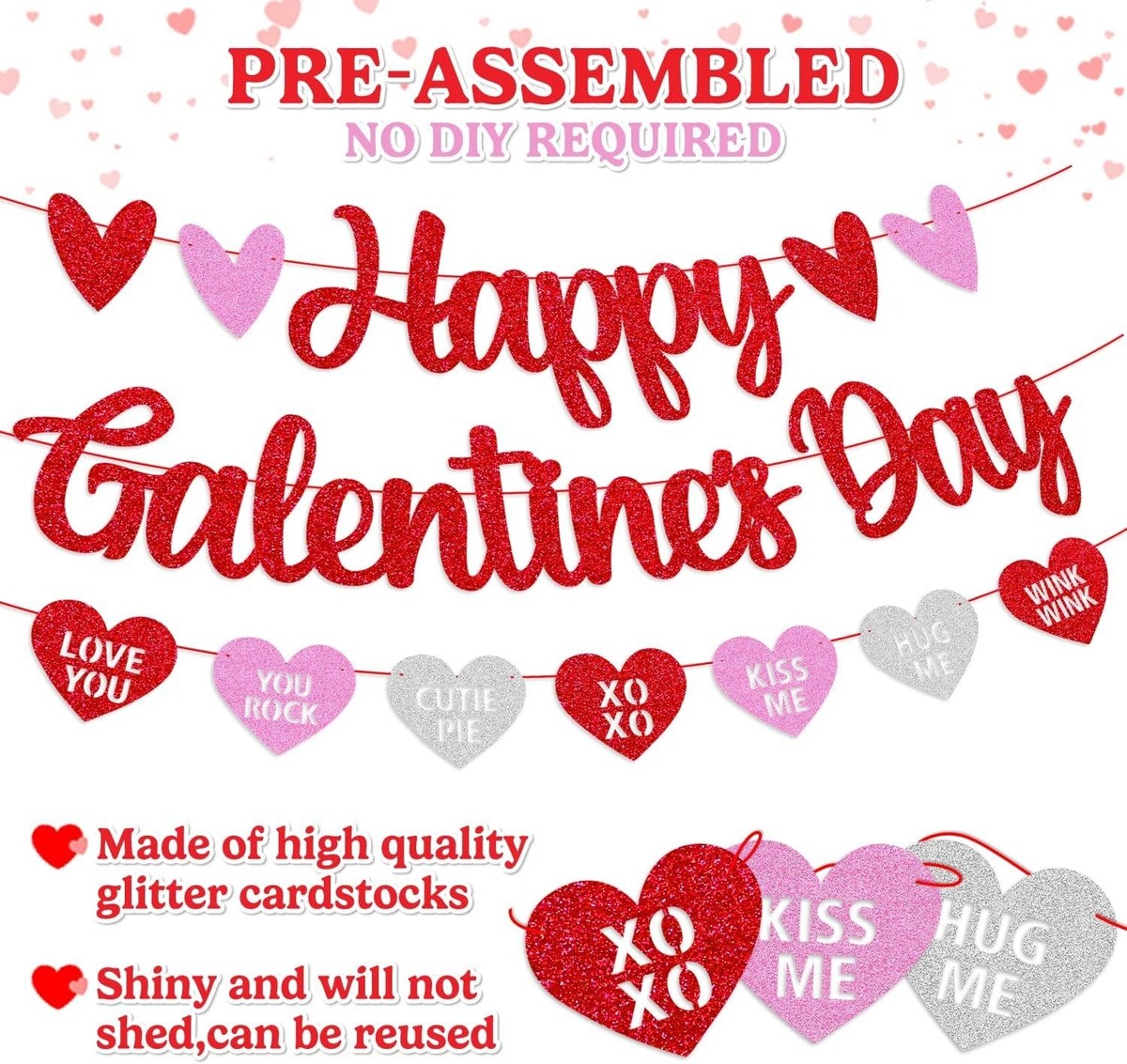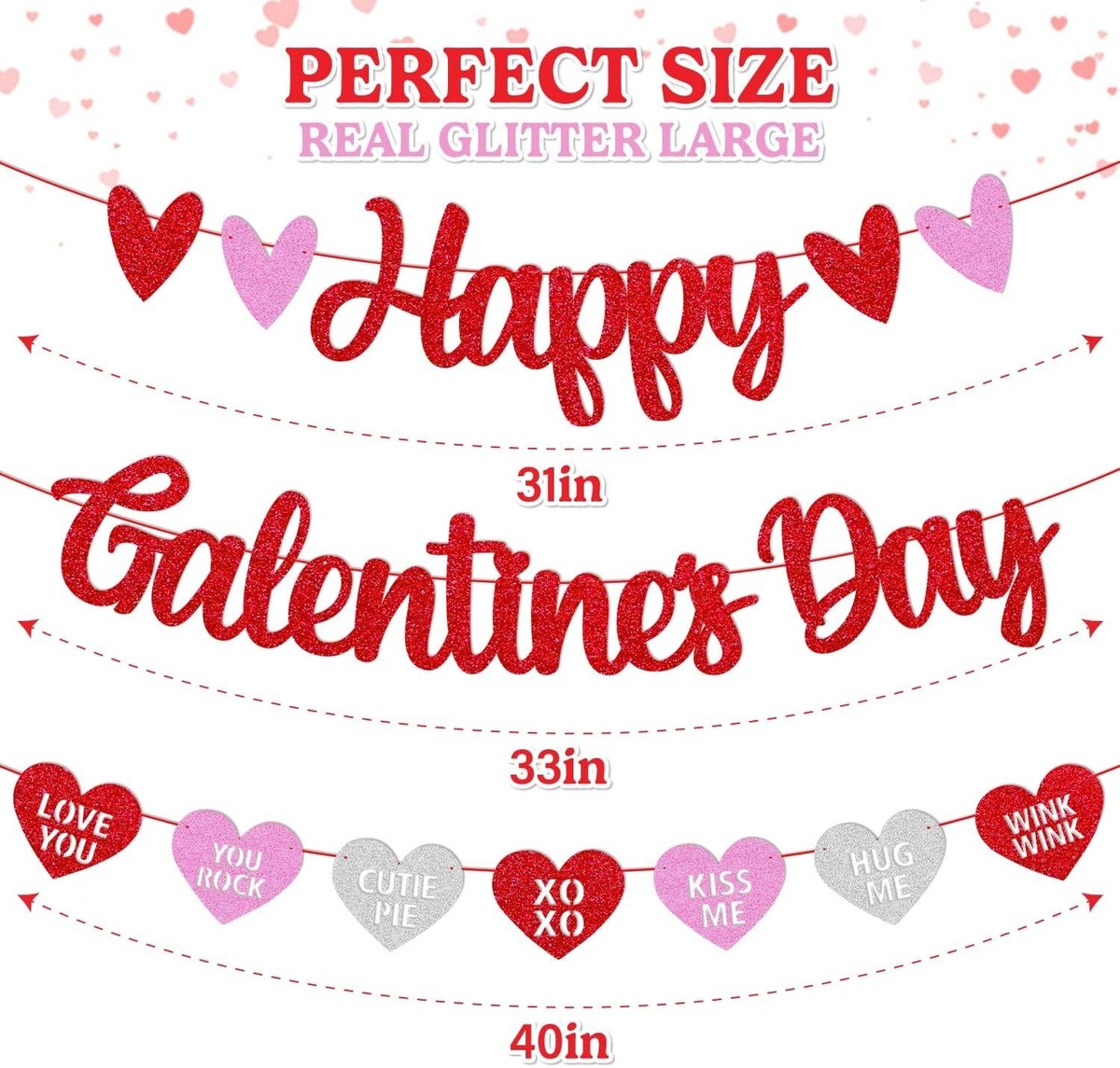 Measures approximately 31 inches for "HAPPY" with 4 glitter hearts and 33 inches for "GALENTINE?S DAY".