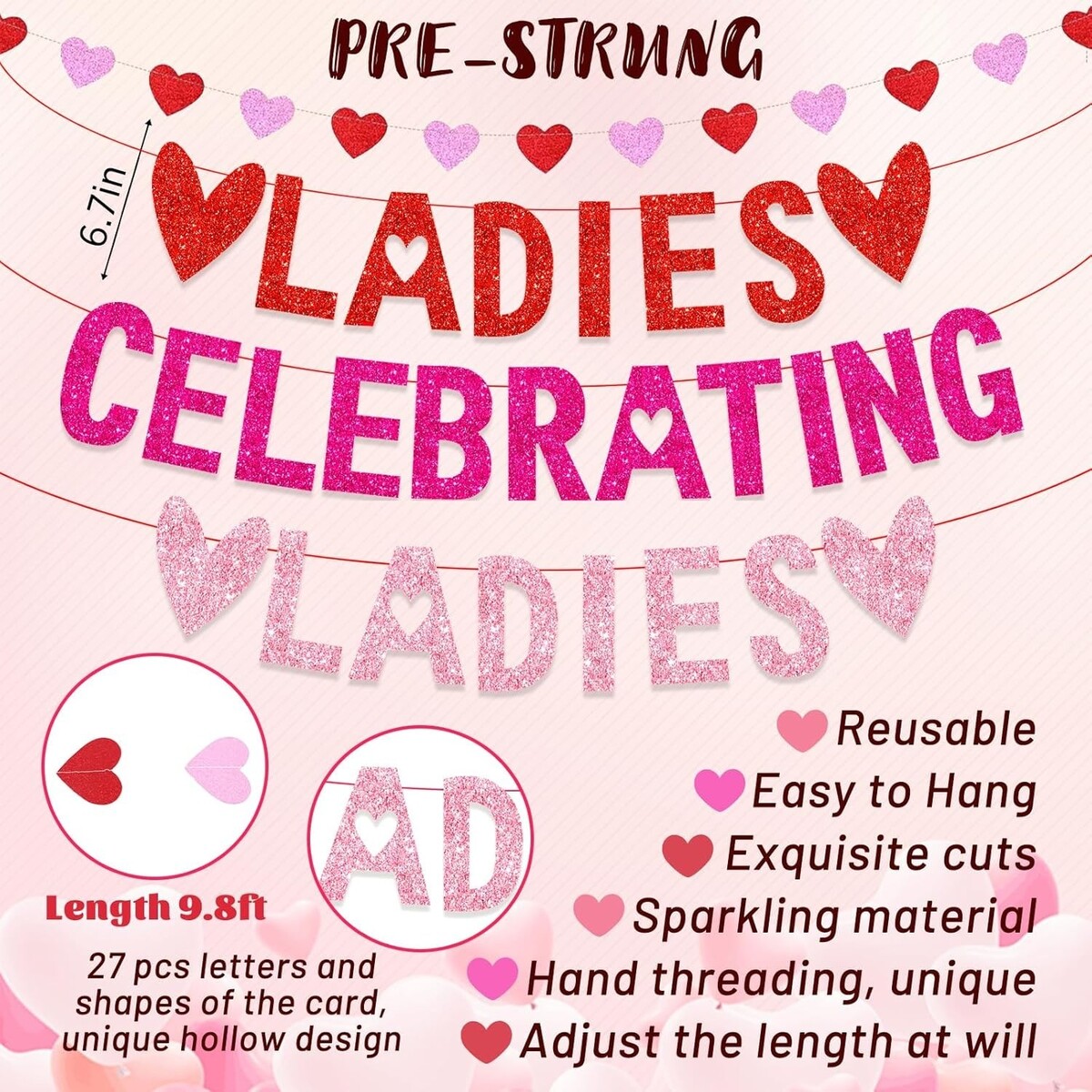 Elevate your Galentine's Day celebrations with our stunning Pink Glitter Hearts Swirls Decor. Crafted with elegance and festivity in mind, this banner set is an absolute must-have for your ladies' gathering.