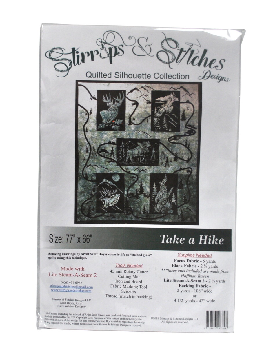 Take a Hike Quilt comes with 5 ready to iron black fabric laser cuts with the wildlife designs (whitetail deer, eagle, moose, elk, and grizzly bear) already cut out as well as easy to follow instructions to complete your project.
