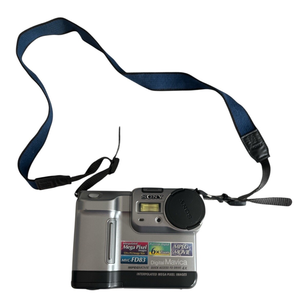 Vintage Sony Digital Mavica MVC-FD83 digital still camera featuring floppy disk storage and MPEG movie capability. This early digital camera records images directly to 3.5-inch floppy disks and represents a unique moment in late-1990s to early-2000s digital photography history. Popular with Y2K collectors, retro tech enthusiasts, prop stylists, and display collections. Made in Japan.