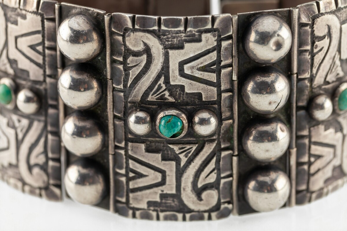 Mid Century Casa Prieto Sterling Silver Turquoise Wide Panel Bracelet 7"