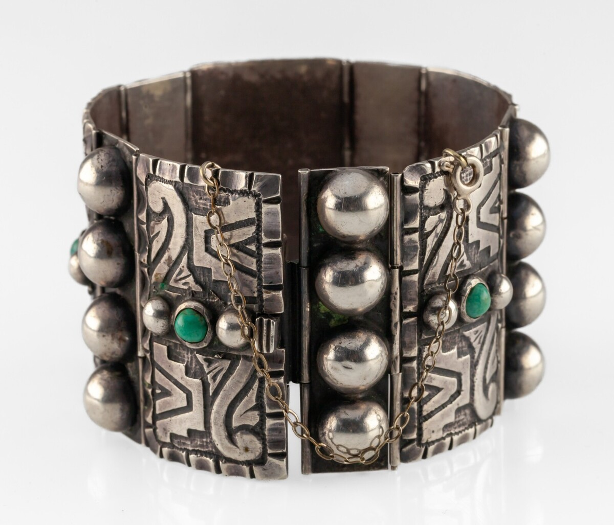 Hand made bracelet with bezel set Turquoise stones (5) in Aztec inspired Panels