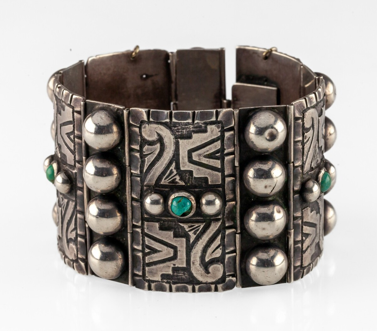 Vintage Taxco Mexico Sterling Silver Green Stone Panel Bracelet 7.25"