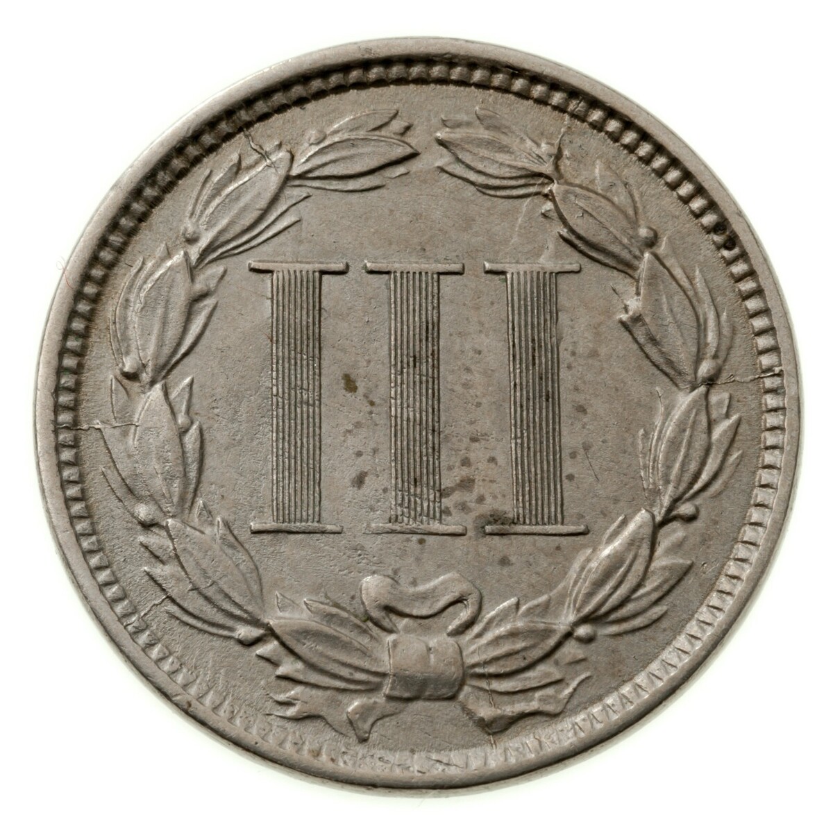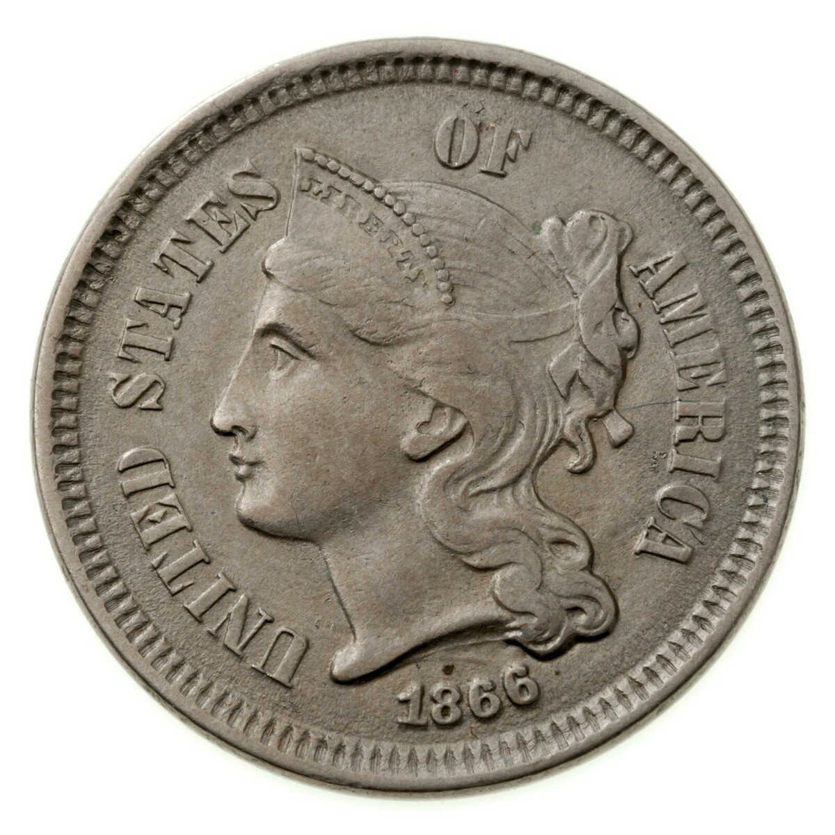 1866 3 Cent Nickel 3CN in extrafeinem XF-Zustand, natürliche Farbe, starke Details