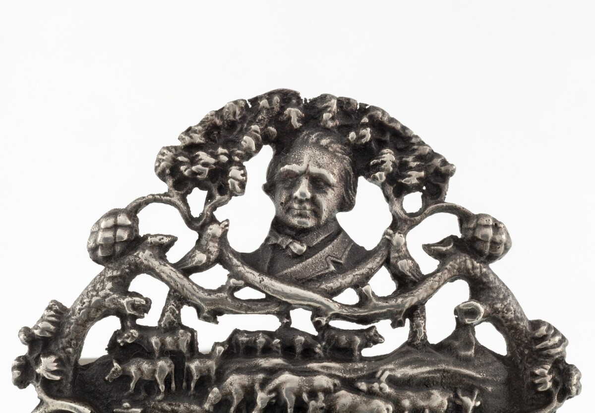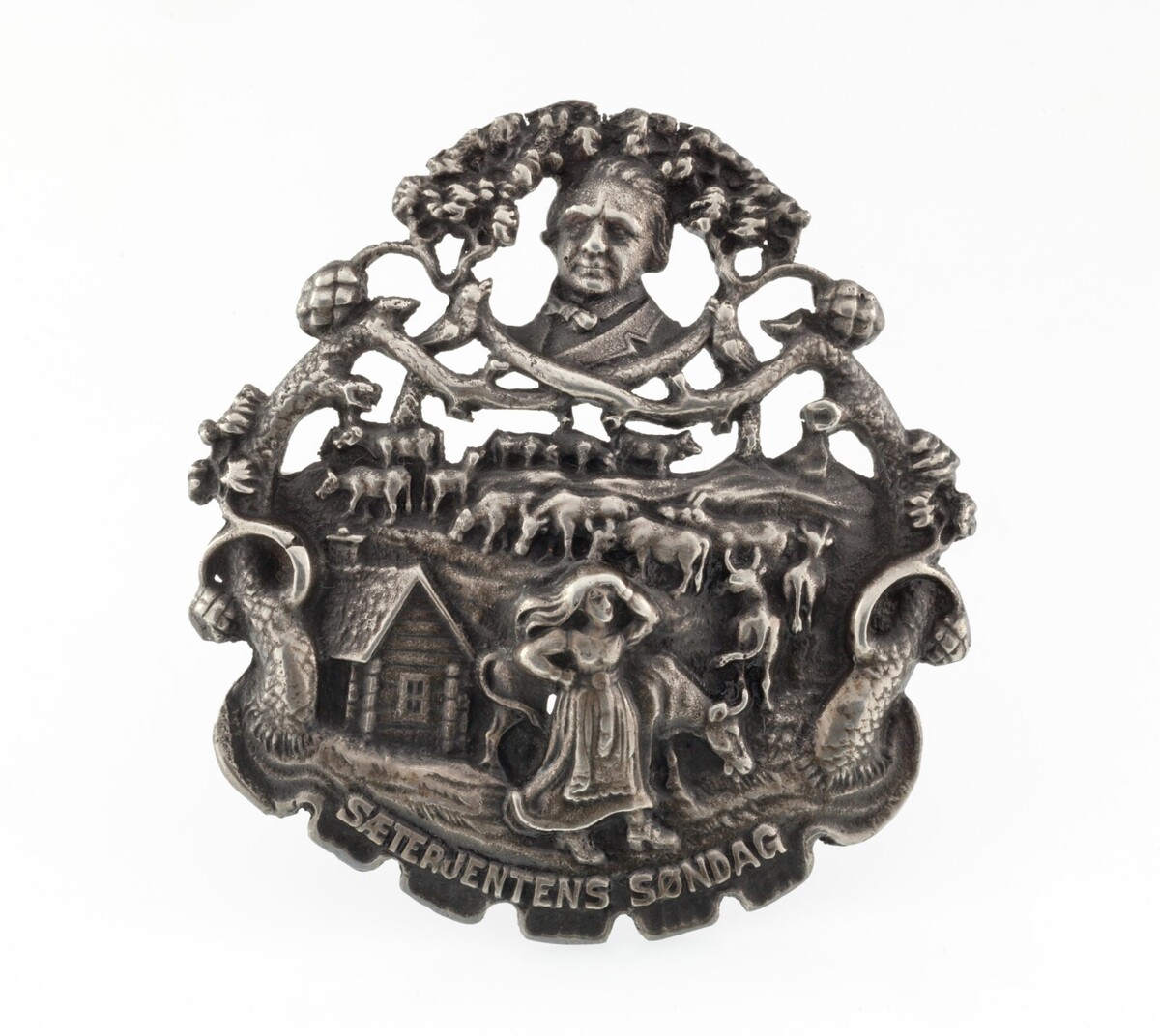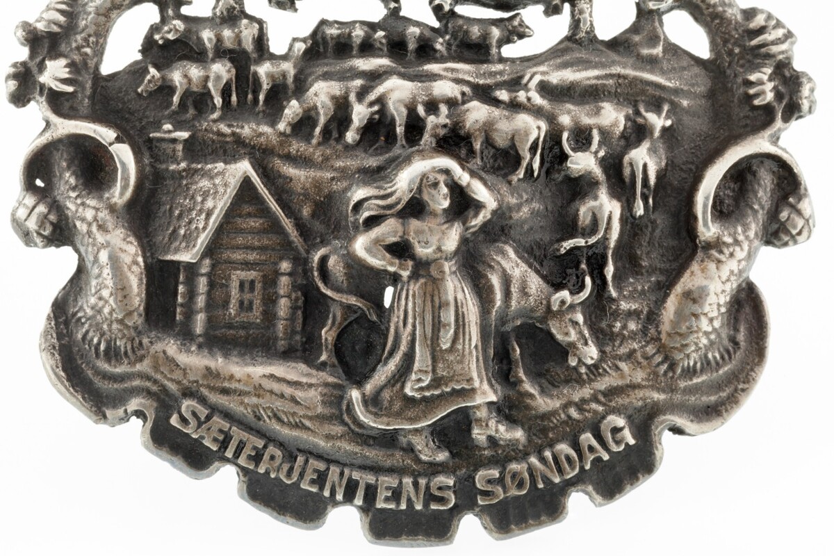Wunderschone Brosche einer Frauen, die mit einem Bauernhaus und einem Vieh im Hintergrund in die Ferne schaut. ltere mannliche Büste oben beschrieben Szene. Unten liest "Saeterjentens Sondag"