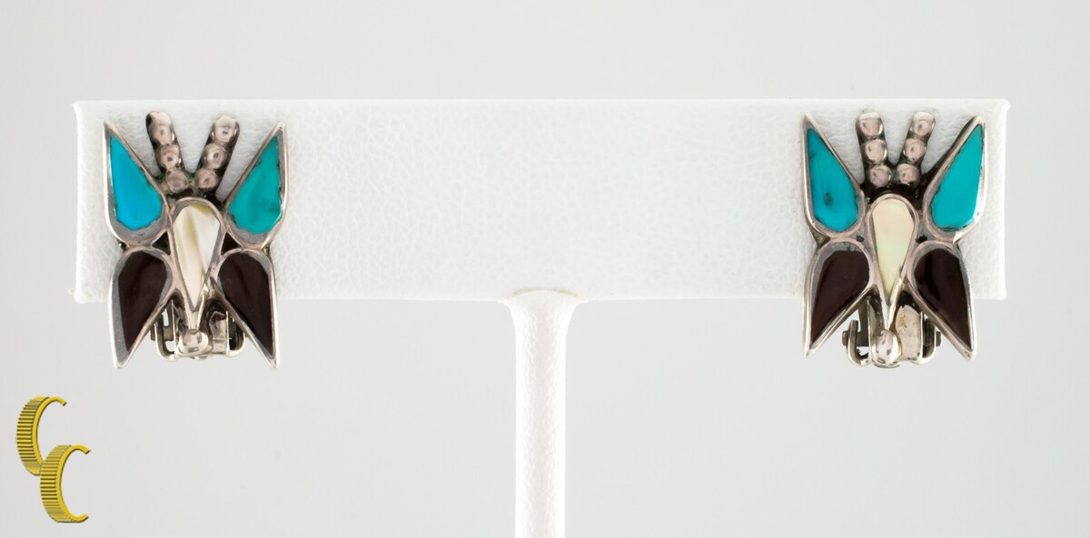 Sterling Silver Lapidary Inlay Clip-On Earrings Turquoise Coral MOP Onyx
