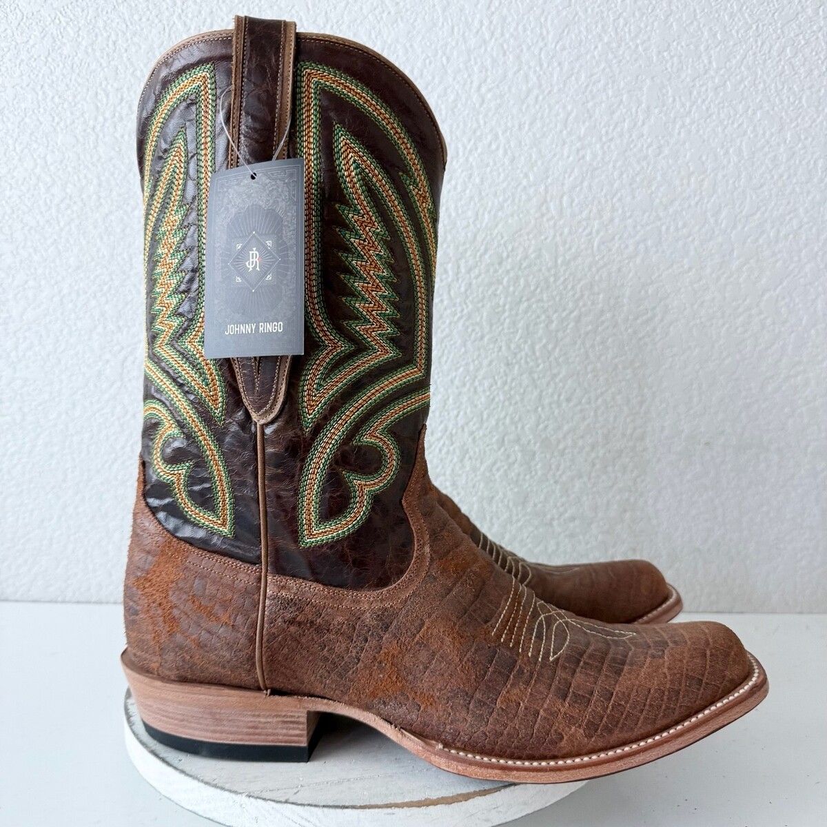 These Johnny Ringo men?s western cowboy boots feature a classic square toe with rich brown leather and detailed stitched shafts. Traditional pull-on styling with leather soles makes them suitable for everyday wear, riding, or western events. Quality craftsmanship throughout, consistent with Johnny Ringo?s reputation for bold western design.