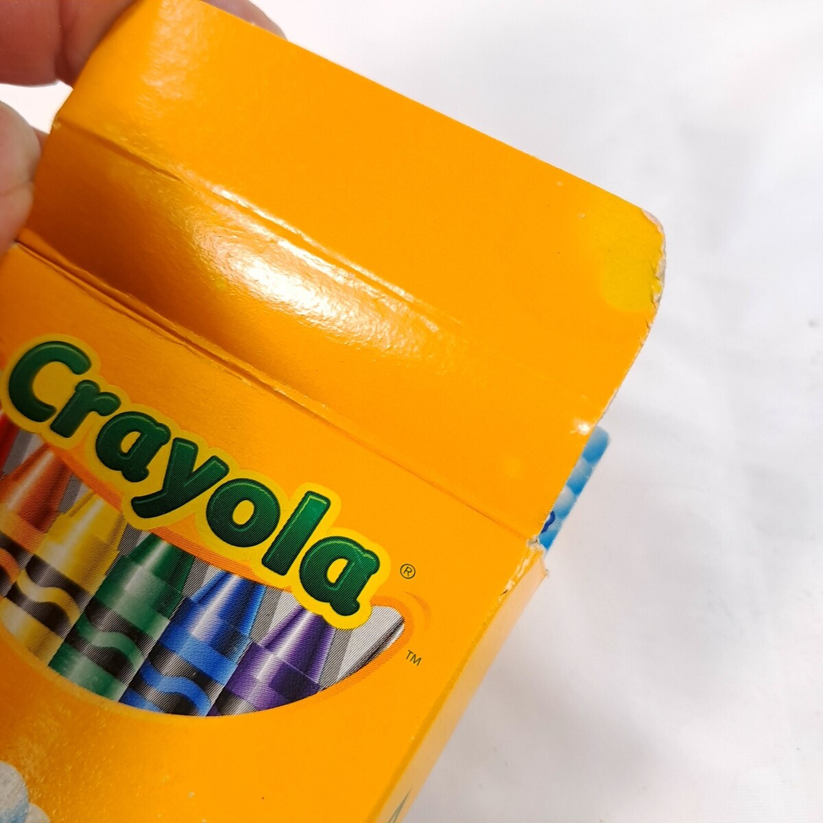 Not sure if the crayons have been used, but some of the papers are coming off the crayons. Box has wear/marks as shown and may have been wet at one point due to the texture. See pics
