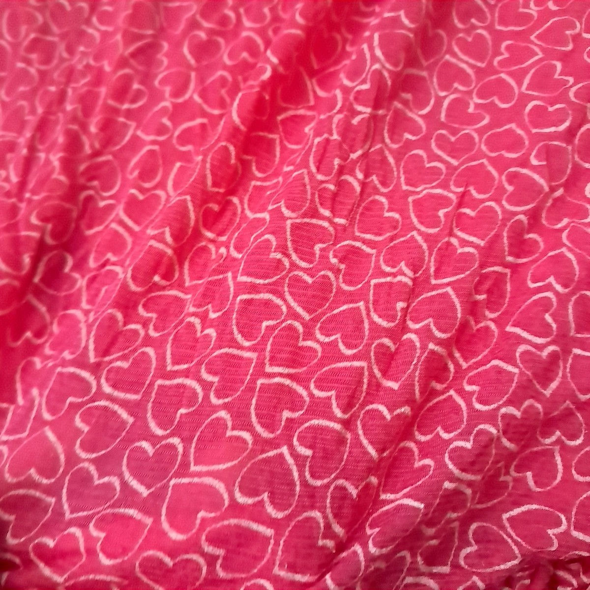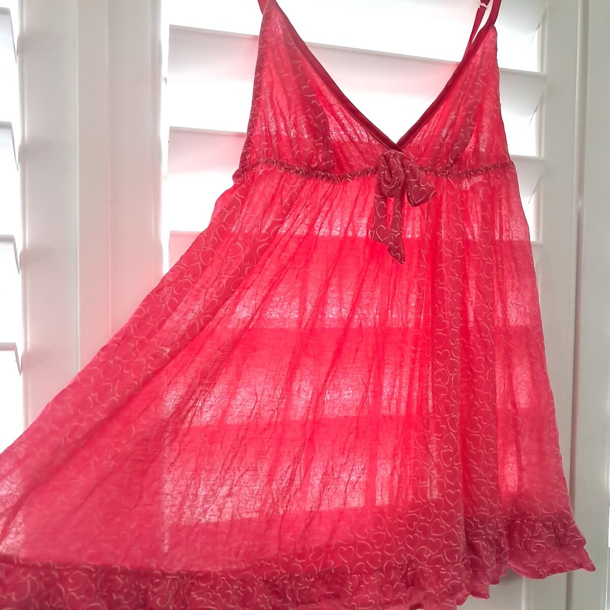 Sheer hot pink with hearts camisole/cami style baby doll top. Ruffles on the bottom. Adjustable straps.