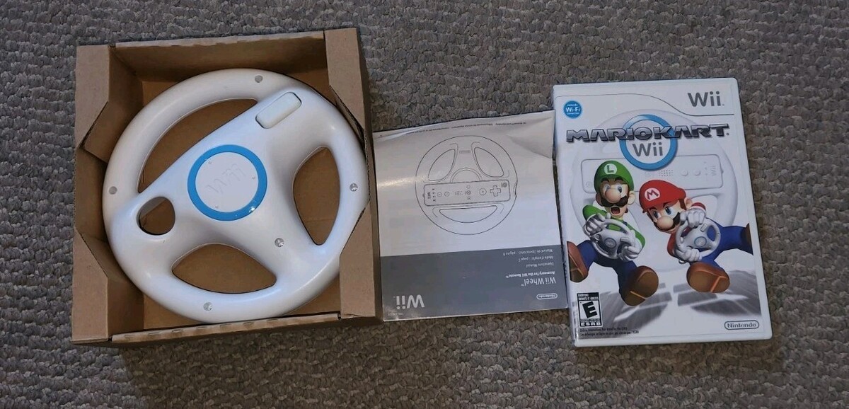 Used MArio Kart. Wii. Comes with Wii wheel . Box has minimal wear.