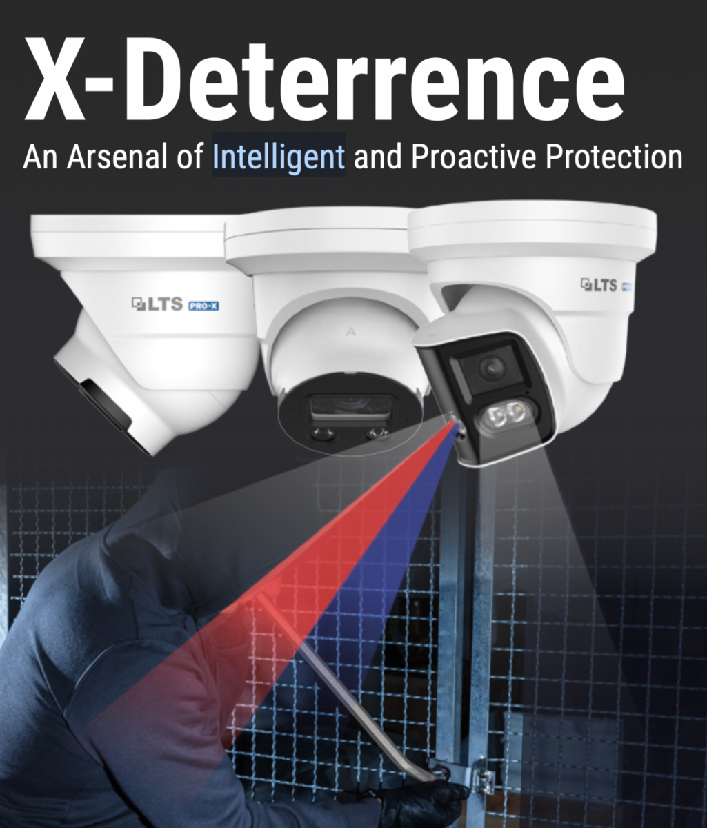 X-Deterrence: Active deterrence featuring siren and visual alerts (red and blue flashing lights)