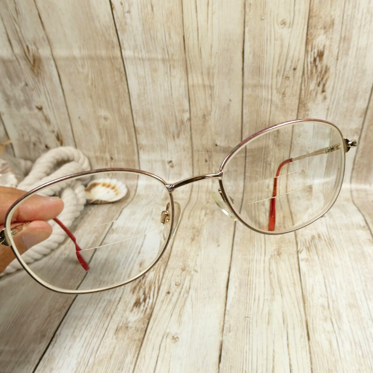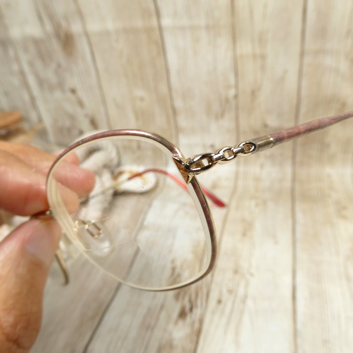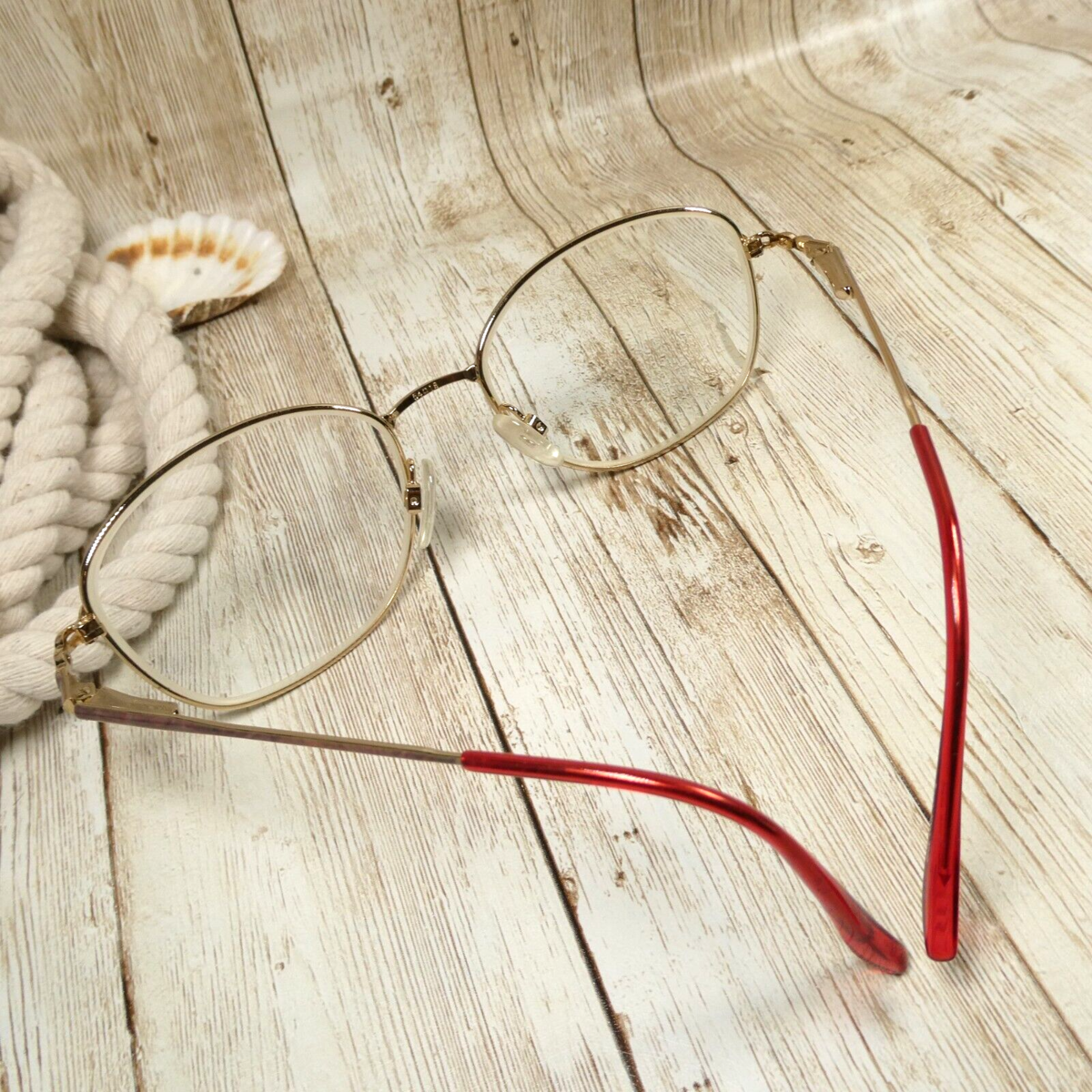 Gold-toned metal full-rim frame.
