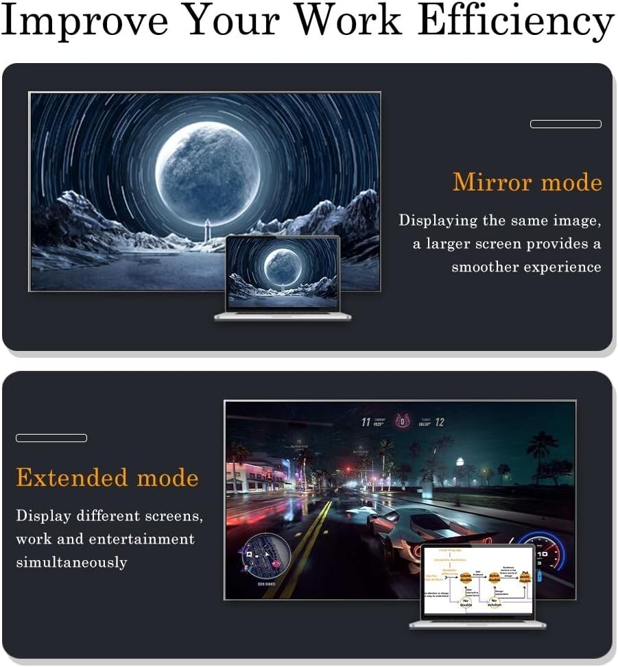 Supports 8K@60Hz and 4K@120Hz resolutions with ultra-clear visuals and seamless motion. Fully backward compatible with HDMI 2.0/1.4, ensuring reliable performance across all devices.
