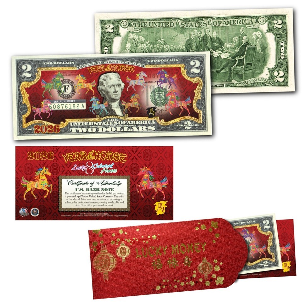 2026 CNY Lunar Chinese New YEAR OF HORSE Polychromatic 8 HORSES $2 Bill RED