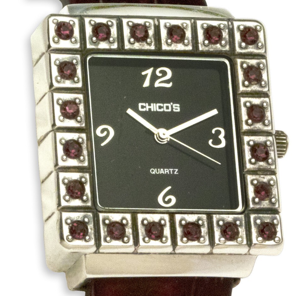 Case: Square dial, black dial, silver stainless steel case, silver indices numbers 12, 3, 6, 9, silver hands, alligator style leather reddish brown band with stainless steel tips, surrounded by red stones on rectangular bezel, stainless steel back, inscribed Chico?s Quartz