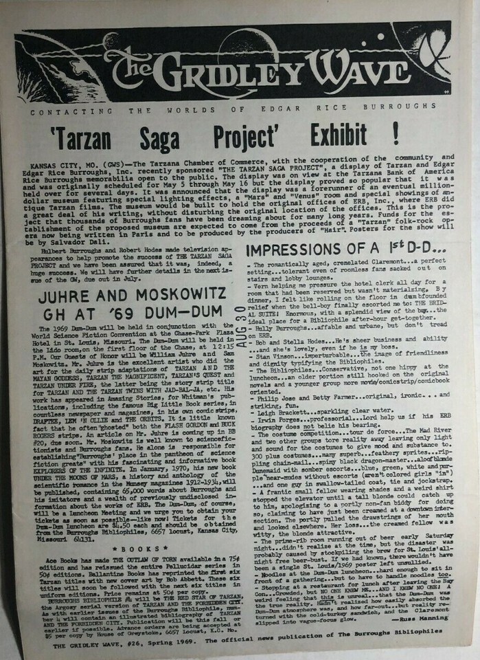THE GRIDLEY WAVE #26 1969 4-page early ERB Tarzan Edgar Rice Burroughs fanzine