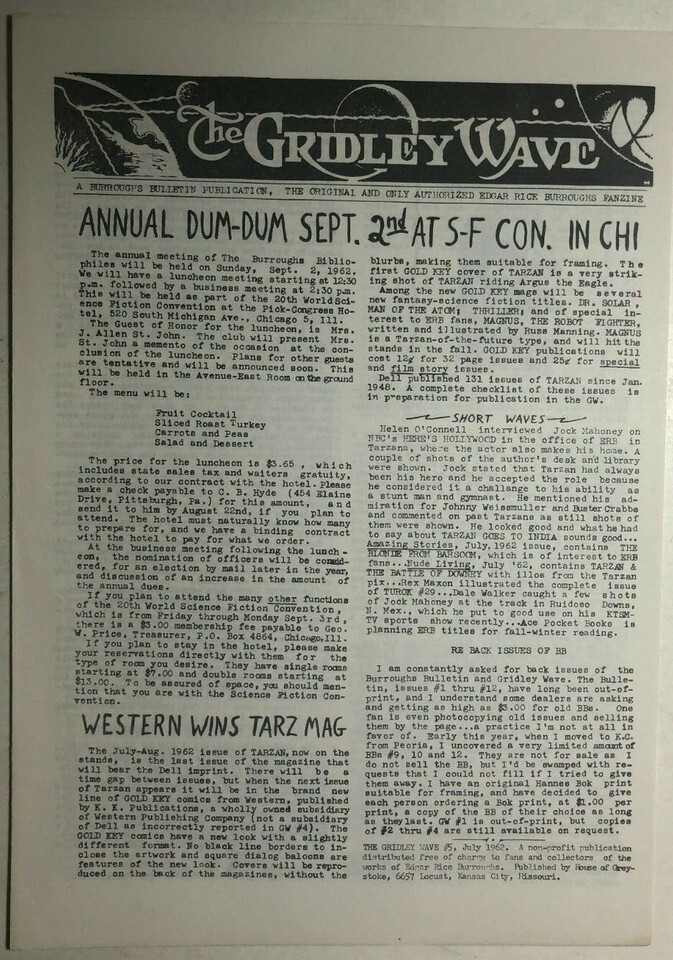 THE GRIDLEY WAVE #5 (1962) 4-page early ERB Tarzan Edgar Rice Burroughs fanzine