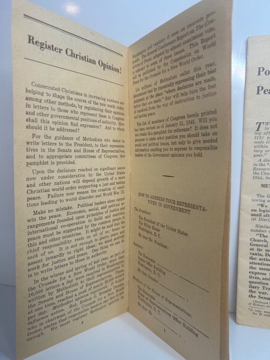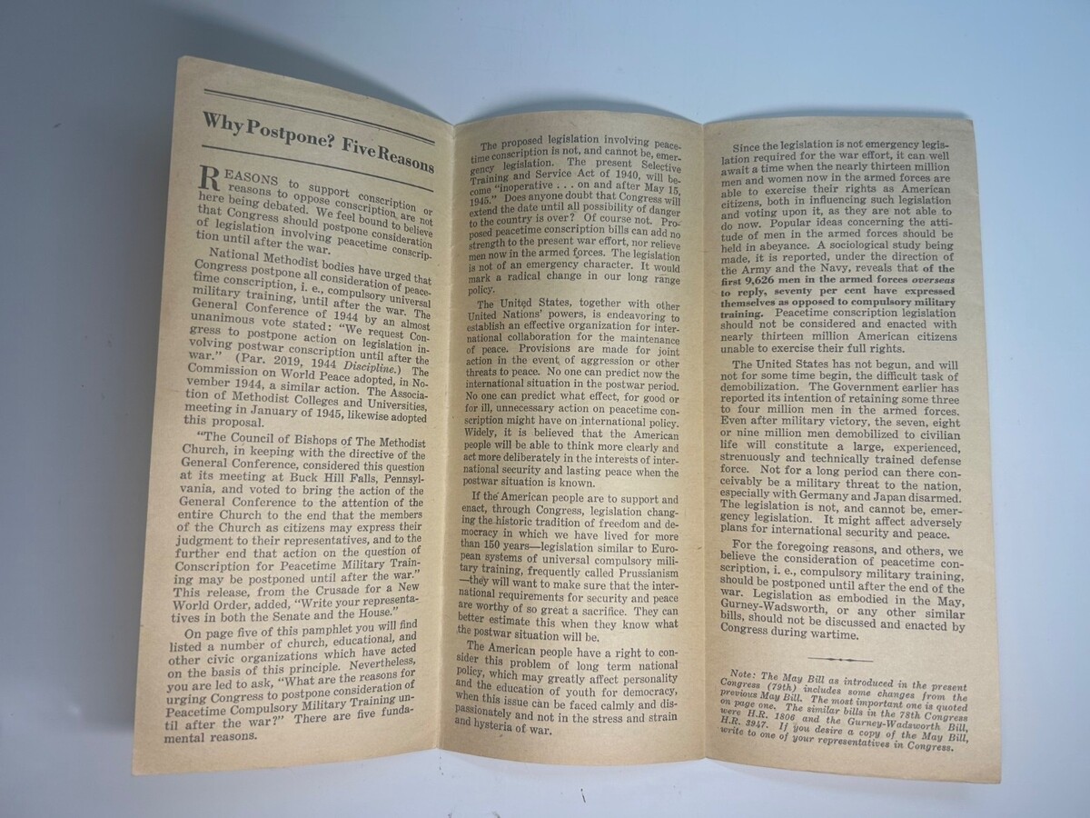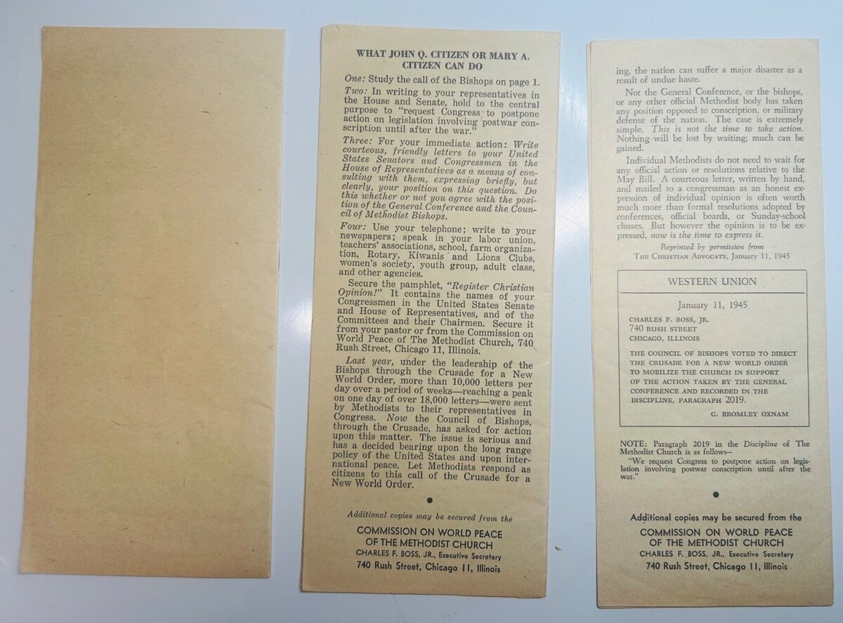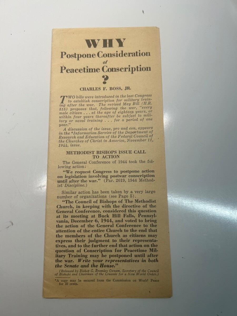 Offered here is a remarkable trio of original 1944?1945 Methodist Church political?advocacy pamphlets, all tied to the denomination?s organized campaign urging Congress to delay or reject peacetime conscription and Universal Military Training at the end of World War II. These are authentic period documents produced by the Commission on World Peace of The Methodist Church, featuring the work of Charles S. Boss, Jr. and Bishop G. Bromley Oxnam, two major figures in the Church?s postwar policy movement.
