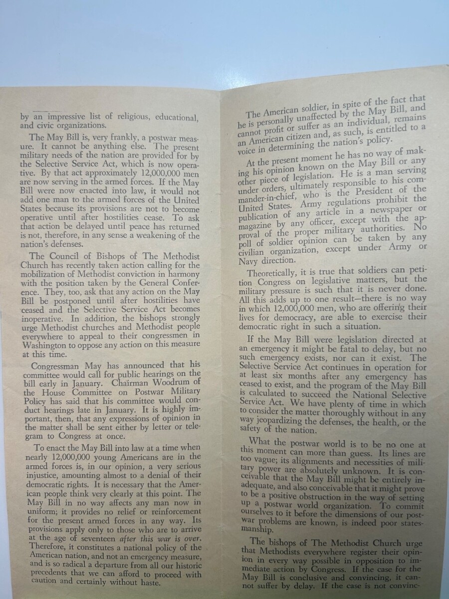 Together, these pamphlets form a complete snapshot of the Methodist Church?s organized political mobilization during a pivotal moment in U.S. history ? the transition from wartime to peacetime and the national debate over postwar military policy.