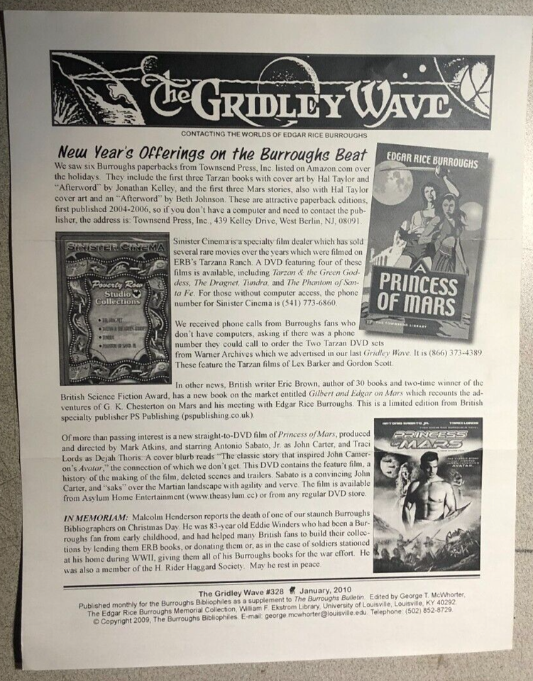 THE GRIDLEY WAVE #328 (2010) 2-page Edgar Rice Burroughs Tarzan fanzine