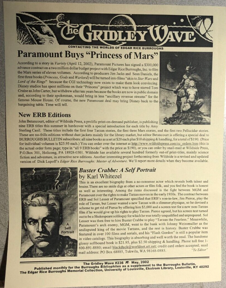 THE GRIDLEY WAVE #236 (2002) 2-page Edgar Rice Burroughs Tarzan fanzine