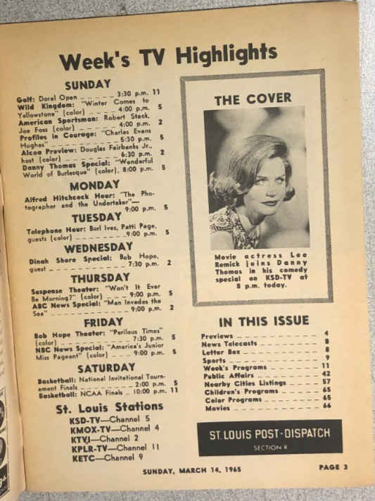 TV MAGAZINE St. Louis (MO) Post-Dispatch March 14 1965 Lee Remick cover