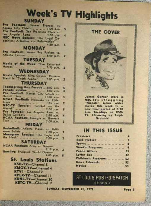 TV MAGAZINE St. Louis (MO) Post-Dispatch November 21, 1971 James Garner cover