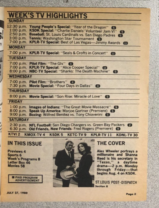 TV MAGAZINE St Louis (MO) Post-Dispatch July 27 1980 Shanna Reed TEXAS cover