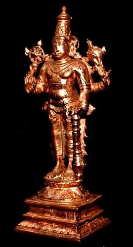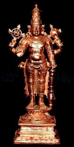 Design : This Copper statue of Lord Vishnu is very impressive made in the hoysala style from artisians of south india with ornate jewelry .Vishnu?s face is perfectly shaped giving him a truly divine appearance. His face is angular and sharp with his oval eyes almost looking through you with the power of his gaze. Vishnu has a magical face and pure expression! He is dressed in royal silk garments and holds in his three hands the sankha (conch), chakra (discus), gada (mace), and fourth hand in abhay mudra.