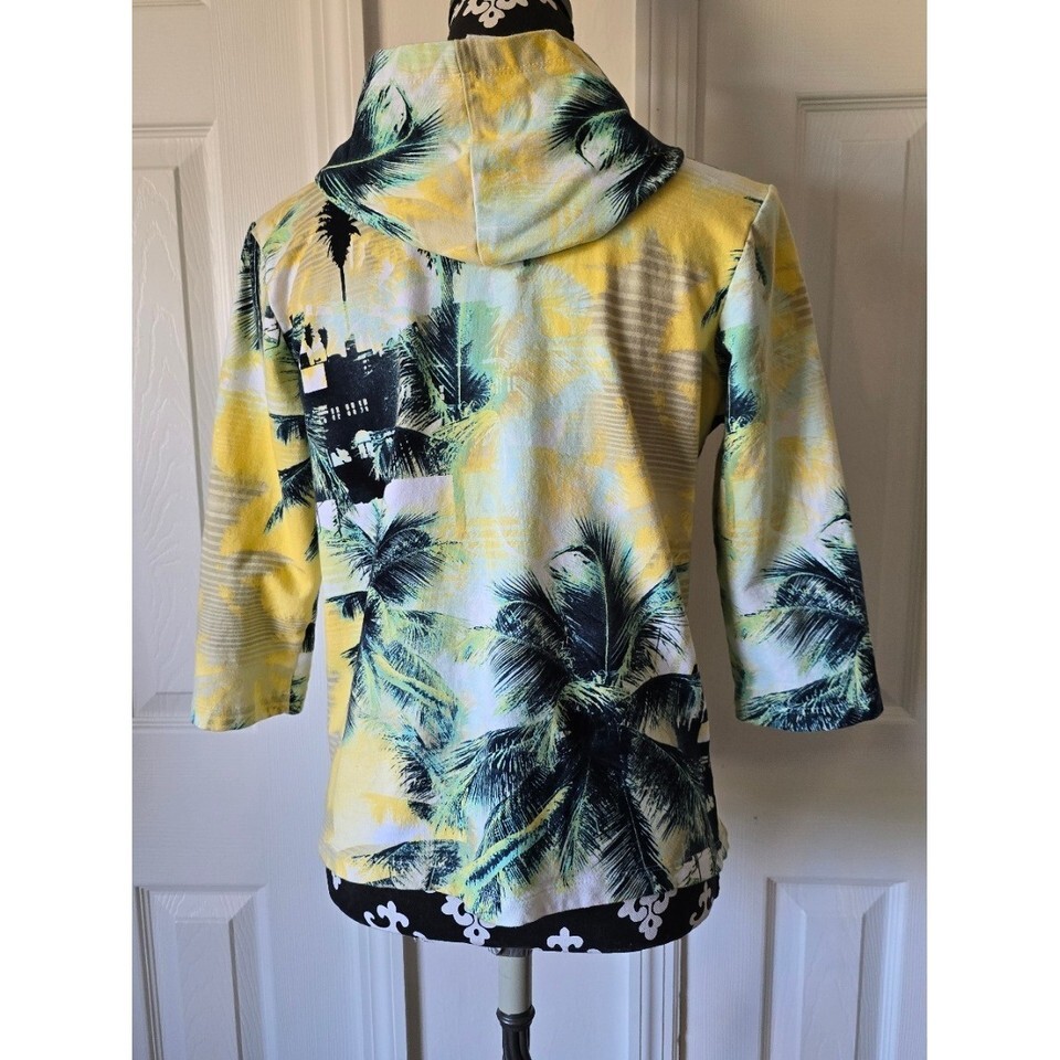 Keywords: tropical print, palm tree, zip hoodie, 3/4 sleeve, yellow green, casual wear, vacation, beachwear, lightweight, pullover, summer fashion, resort wear, laid back