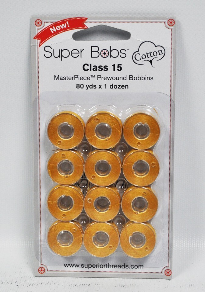 Class 15 Bobbins #157 Wheat Fields. Super Bobs are prewound bobbins that are wound with Masterpiece Egyptian-grown extra-long staple cotton thread. Masterpiece bobbins create precise stitches, have very little lint, and lasts longer due to precision winding. These bobbins hold 30-60% more than a self-wound bobbin. 12 Bobbins in package. Class 15 Prewound Bobbins 80 yds. x 1 dozen. Wound with Masterpiece 50 wt. 2-ply Egyptian grown extra long staple cotton thread.