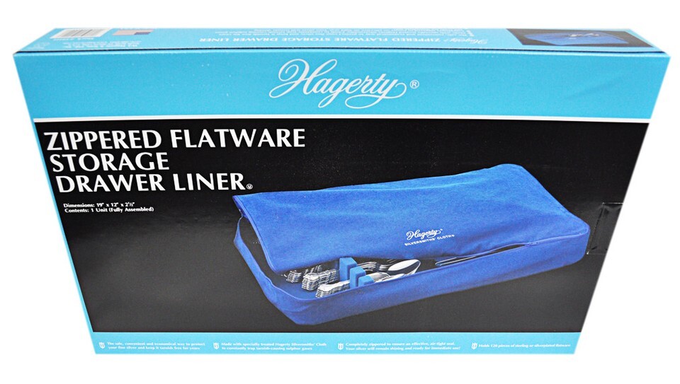 Sterling, silver plate, and gold stay organized and tarnish free for years in the Hagerty Zippered Flatware Storage Drawer Liner.