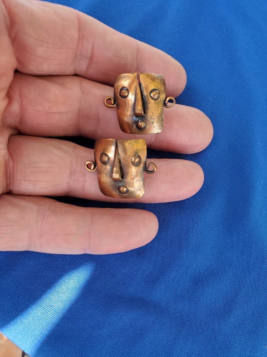 early studio mid century modernist copper earrings featuring faces or mask.