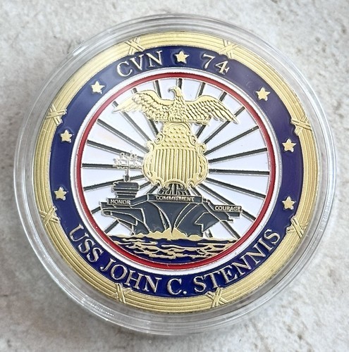 This is a great looking US NAVY - USS John C. Stennis CVN-74 commemorative challenge coin. Coin has reeded edges and is about 1 9/16" in diameter. All details are raised lettering. Coin is contained in an acrylic air tight holder.