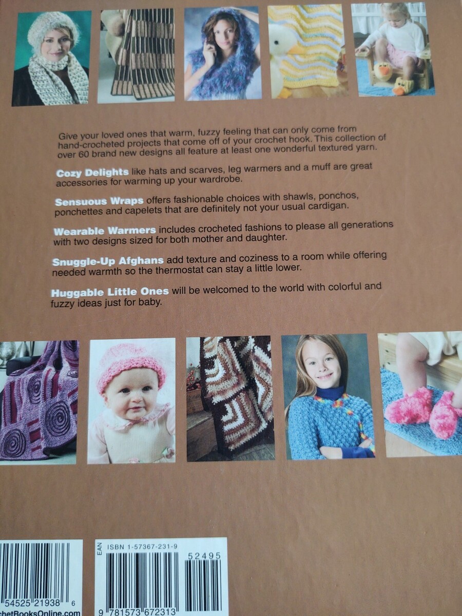 This great book is gently used in good condition. Contains over 60 brand new projects with textured yarn!! Hats, scarves, leg warmers, muff, shawls, ponchos,caplets, afghans, and baby items are included. Thank you for stopping by and please visit my other items for more great deals!