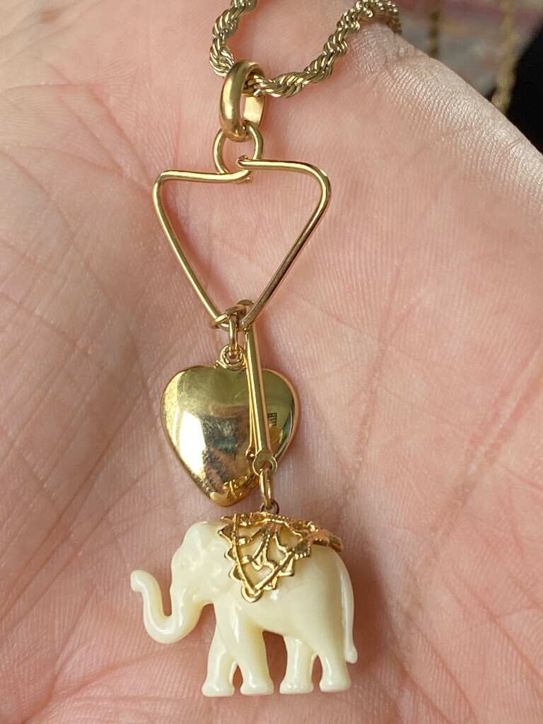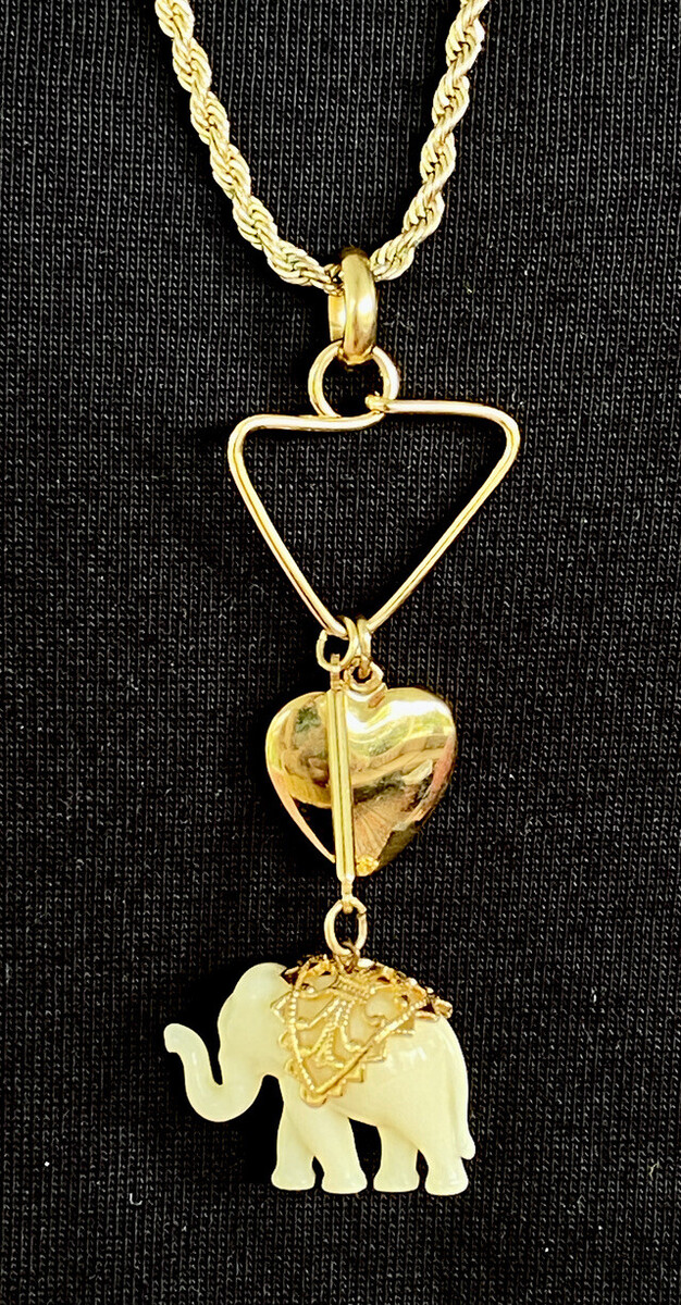 RARE Vintage Trifari Goldtone Elephant Heart Pendant Necklace Signed 30" Rope Chain