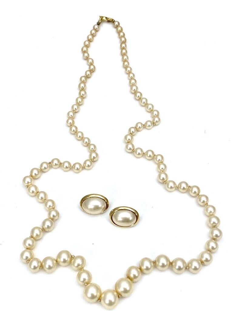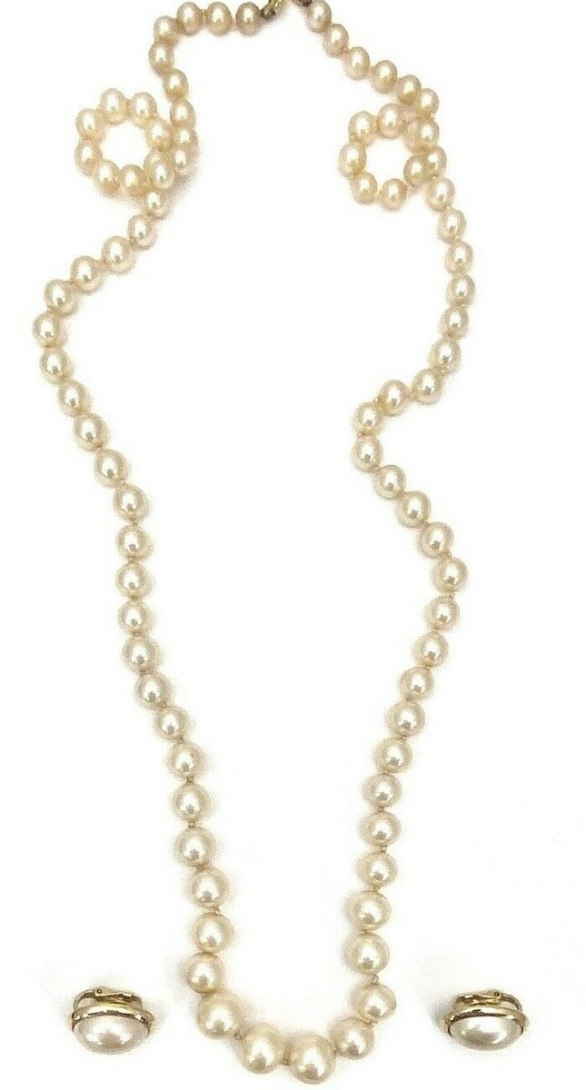 Necklace of graduated faux pearls is 30" long, Earrings are 1", and clipback..It is a beauty and in mint condition.