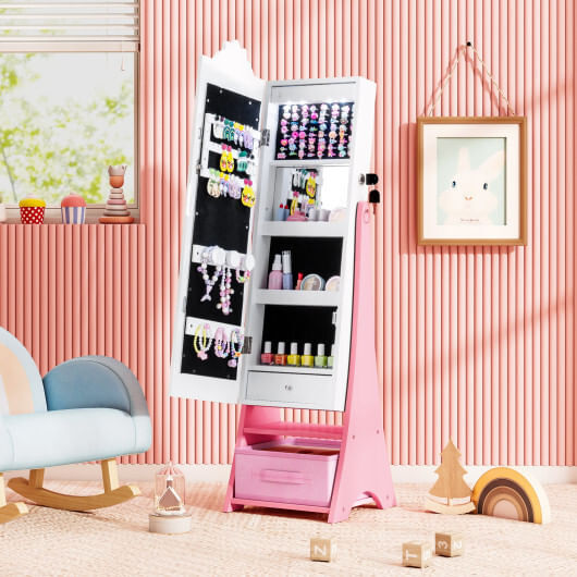 Kids Jewelry Armoire Freestanding Jewelry Cabinet with 3-Color Lighted Full Length Mirror-Pink