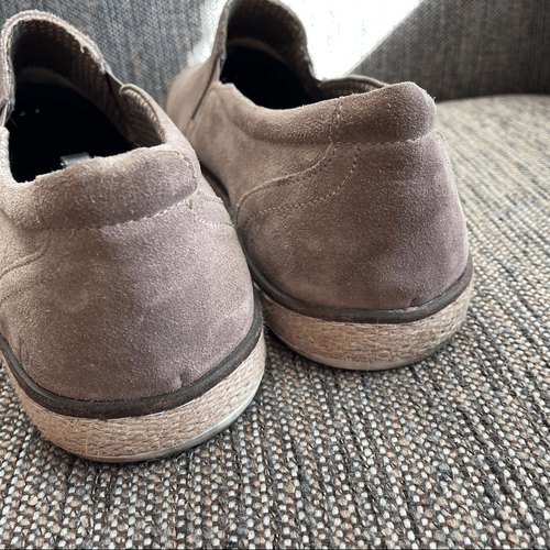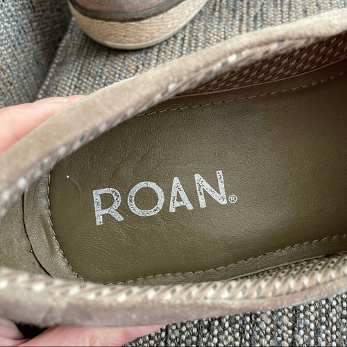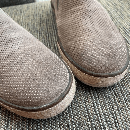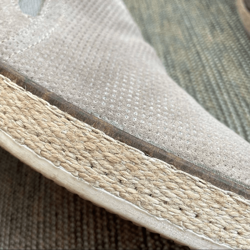 Roan taupe perforated suede leather upper loafers with textile woven outsole (like espadrilles) and white manmade sole.