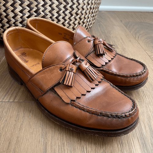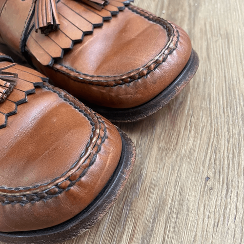 Allen Edmonds kiltie tassel loafer in tan leather. Gently preowned. 100% leather. Heel taps have been added, and there is a moleskin patch On the inside under the tassel for comfortable wear. $425 retail.