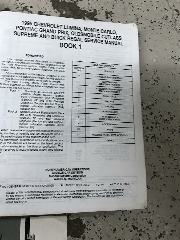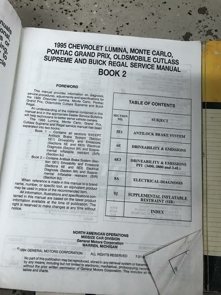 Manuale Di Servizio E Riparazione Per Officina Set 1995 Chevy Monte Carlo Lumina
