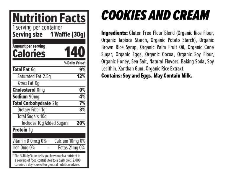 Chocolate lovers and vanilla purists unite in the classic flavor combo of Cookies Cream. A delicious vanilla cream flavored filling gets sandwiched between two dark chocolate crispy thin waffles for a most perfect union. Whether it's dessert for breakfast, after dinner or anytime in between, the vanilla-chocolatey explosion will satisfy your sweet tooth and give you the energy you need to perform at your best! And as a powerful bonus? it?s gluten-free too (you wouldn?t have known if we didn?t say anything)! 140 Calories 0% Trans Fat 0% Cholesterol
