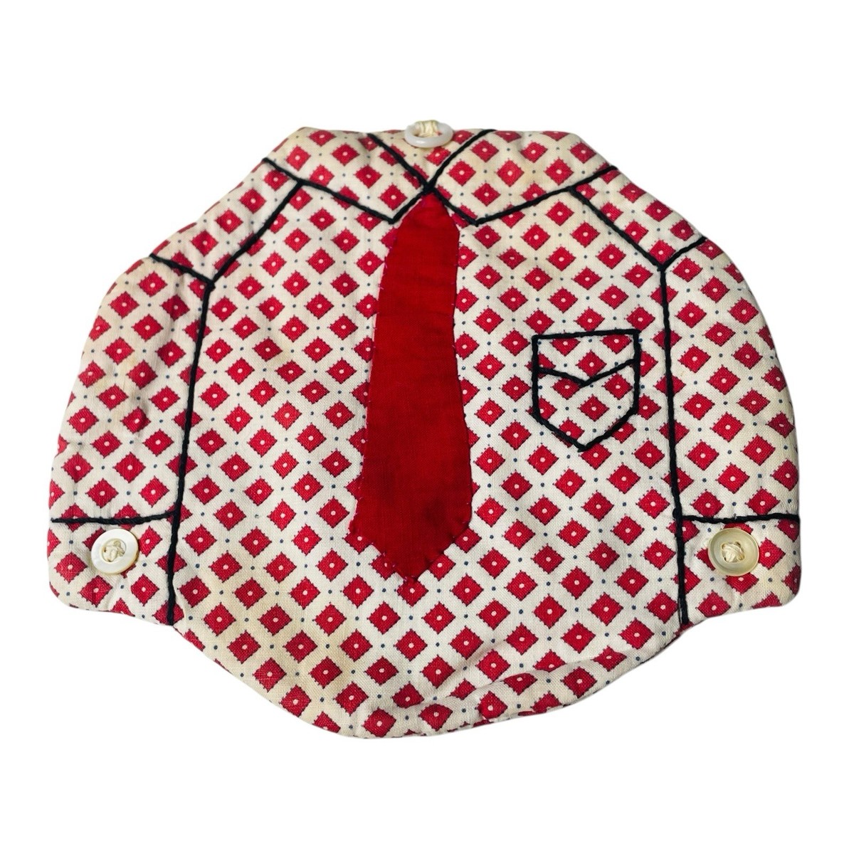 This listing is for a lot of 2 vintage handmade potholders, featuring a geometric red and white shirt and pants design, with a retro clothing shape. Made of cotton and embroidered with buttons, these adorable potholders are perfect for all occasions and are sure to add a touch of charm to your kitchen decor. Handmade in the United States in the 1950s, these potholders are a unique and original addition to any collection of vintage kitchen items.