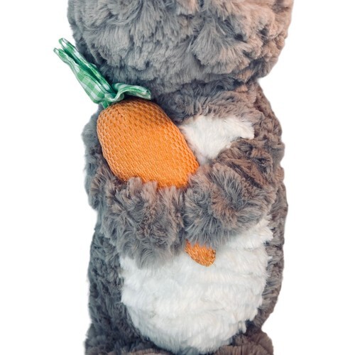 This is one SUPER soft and cuddly bunny rabbit! From Pier One Imports, this tall (26?) bunny is made of beige ultra soft fur with corduroy feet with green and white polka dot fabric paw pads and polka dot ears. He holds a plush carrot in his arms. Simply adorable!