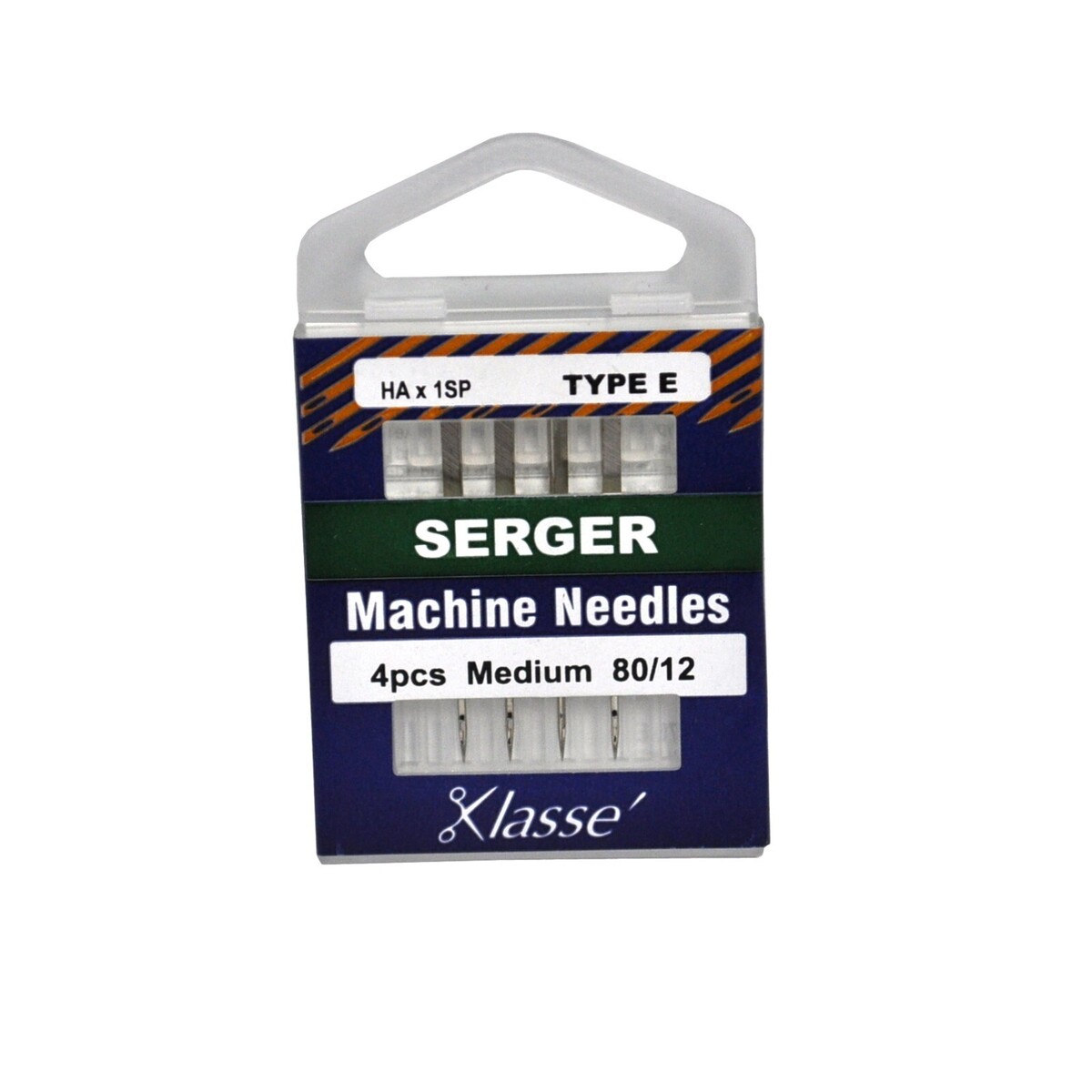 Klasse HAX1SP 170E 80/12 Type E Serger Machine Needles. Serger Type E (HA x 1SP). Medium 80/12. German-Engineered Steel Serger Machine Needles. Unlike sewing machines, sergers use different needle types dependent on the serger make and model. The sharp point penetrates all kinds of fabrics. Use with polyester, cotton, texturized nylon or polyester, fusible, or water soluble thread. Compatible with: Baby Lock SL600/700/700, All BL series, Protage 403. Glove All models, Husky AL3000 series, 34D. Janome 100, 200, 300, 400, and 500 series, Toyota SL3400, SL3403. Four Type E Serger Needles in Package. AA5170.E