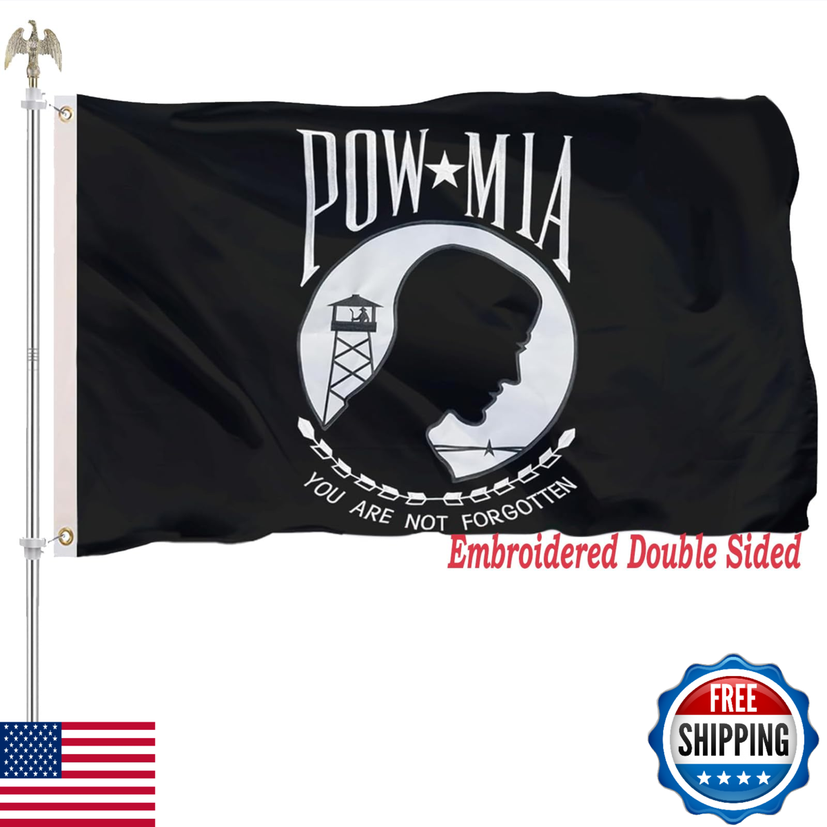 ??340D NYLON CLOTH?-- Double sided embroidery pow mia flag is made of 340D nylon cloth,clear texture and depth,can proudly fly in your home,??TWO BRASS GROMMET?-- 3X5 Pow military flag has two sturdy brass grommet fastened to a durable canvas head, which will make your mia pow flag long time to use,??4 ROW STITCHES?-- Four rows of stitches on the flight hem were used for each edge to improve durability and tear resistance, avoids rapid wear and will ensure longer lasting use,??FADE PROOF?-- We use high-definition printing technology, the pattern is clear, bright colors, with good anti-fading effect. you will immediately notice how amazing the print is. The color is very sharp and vivid,??OCCASION?Pow mia flags perfect for hanging on indoor ,outdoor flagpoles,car,truck,boat,office,home and anywhere you want to show.If you have any questions, please contact us by email and return unconditionally