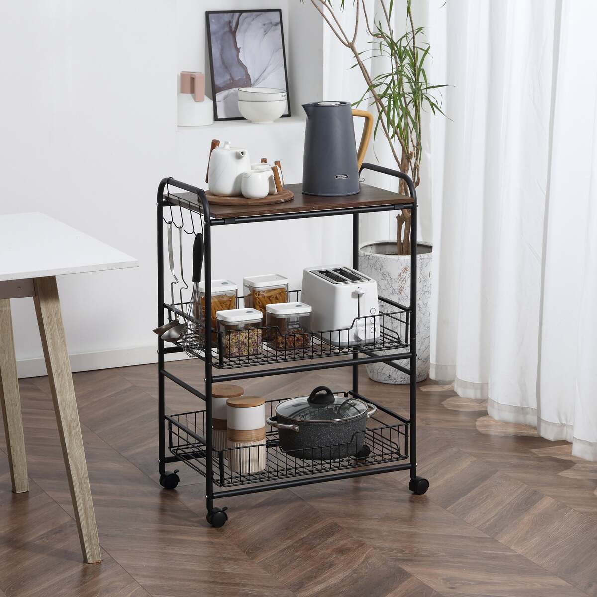HOMCOM 3-Tier Rolling Kitchen Cart with Baskets, Hooks, Walnut