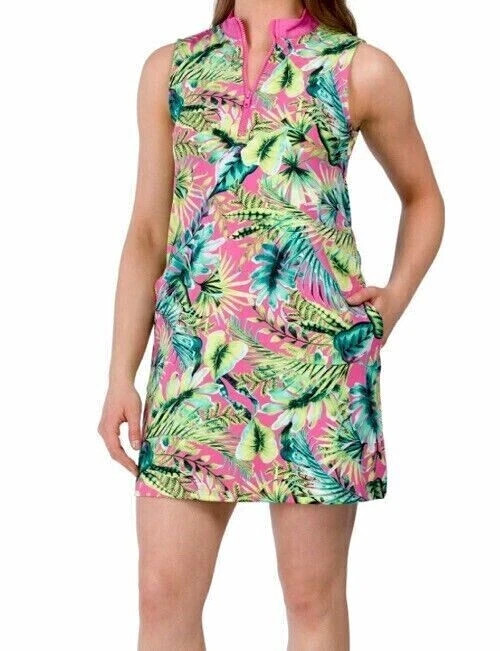 NWT - New With Tags Ladies Womens TOMMY BAHAMA GOLF UPF 50+ Pink Yellow Tropical Leaf Sleeveless Golf Tennis Mock Dress - Size Large (See Measurements) I think they run a little slim thru the bust