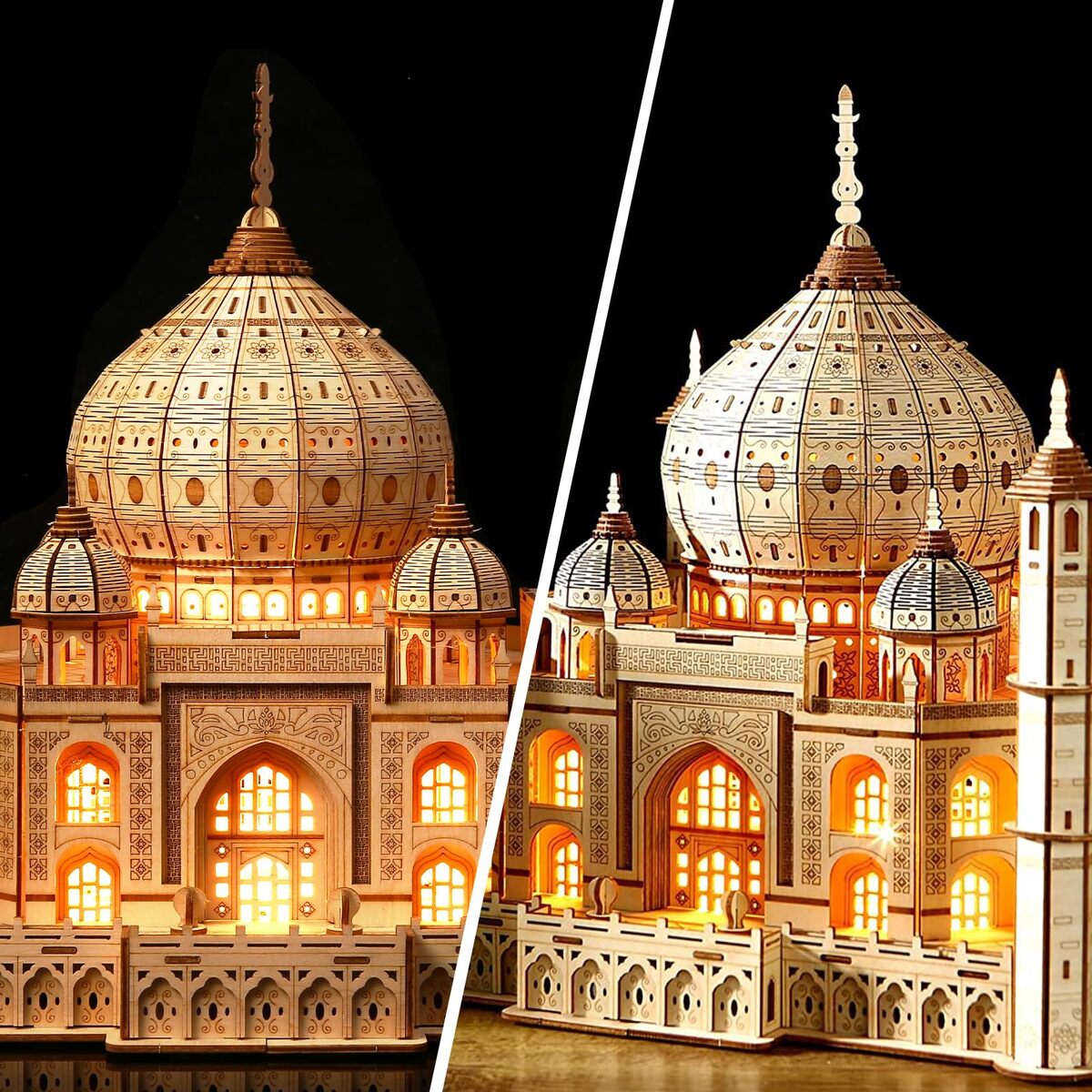 3D Wooden Puzzle for Adults: The Taj Mahal 3-D wood model building kit puzzles are fun and easily assembled. Finished size : 11.4 x 11.4 x 11.4 inches. Installation Difficulty: Medium (3/5). Good for someone who loves puzzle model kits and challenges,Architecture Model with LED Light: A retro Taj Mahal model will come out after assembling. The building display with LED warm light adds a vibe to your room. This 3D puzzle model makes a great decoration for your living room, office, bedroom and more,Assembly Experience No Glue Needed: 388 pcs.The retro castal model will come out after assembling. With partspaper directions to show how the parts go together. All pieces fit together precisely. Easy to assemble, no glue or tools needed,Enjoy Leisure Family Time: Assemble DIY wood mechanical construction model to create fun with family and friend. The complexity of this kit will bring families together for 4-5 hours to create a unique display. Be the proud builder and owner of the model,Birthday Gifts for Women Men: 3D wooden mechanical engineering building model kit puzzle is a good choice for woodworking lovers. With a beautiful packaging. It will amaze on many occasion like birthday, Valentine's Day or Christmas